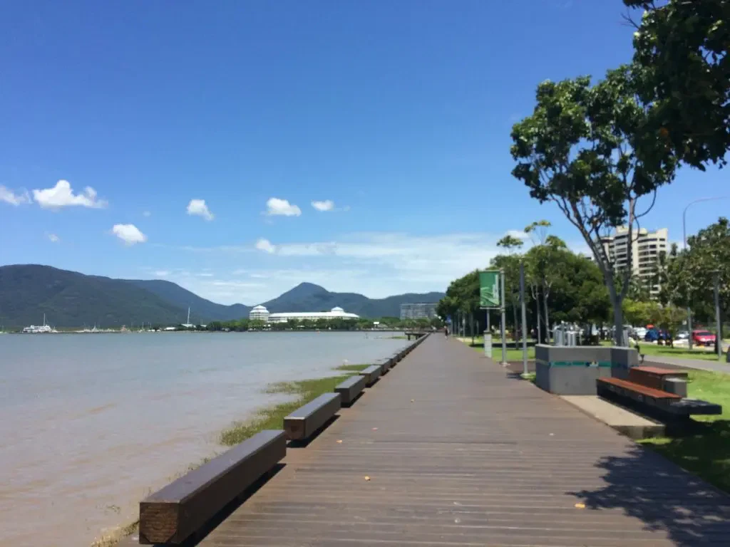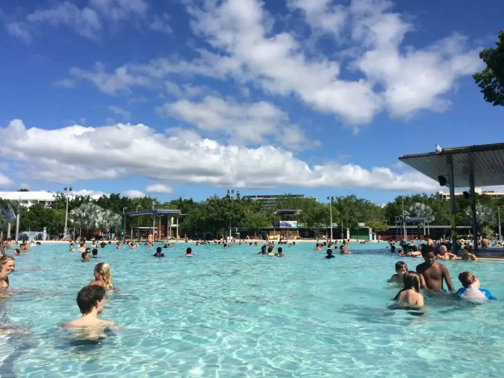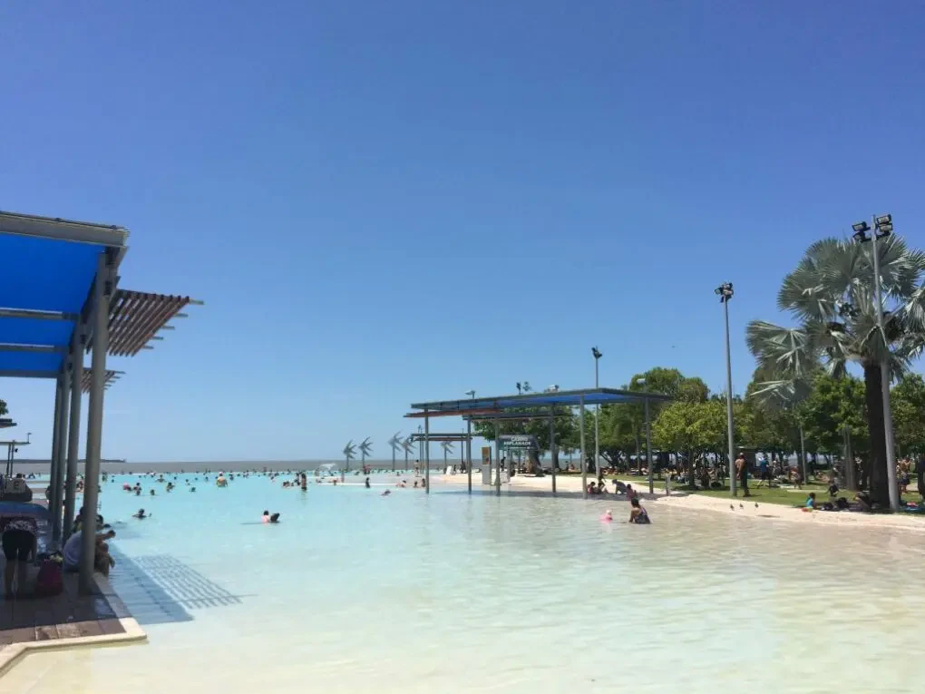 Um sich trotzdem abkühlen zu können gibt es die Cairns Esplanade Lagoon, einen riesigen Pool umgeben von Möglichkeiten für BBQs, Bühnen für Bands, Rasenflächen und Spielplätzen. Das alles kostenlos und für jeden zugänglich. Der mit gefiltertem Salzwasser gefüllte Pool hat eine Fläche von 4800m² und bietet somit Platz für weit mehr als 1000 Leute gleichzeitig. Für die Sicherheit sorgen auch hier Lifeguards.