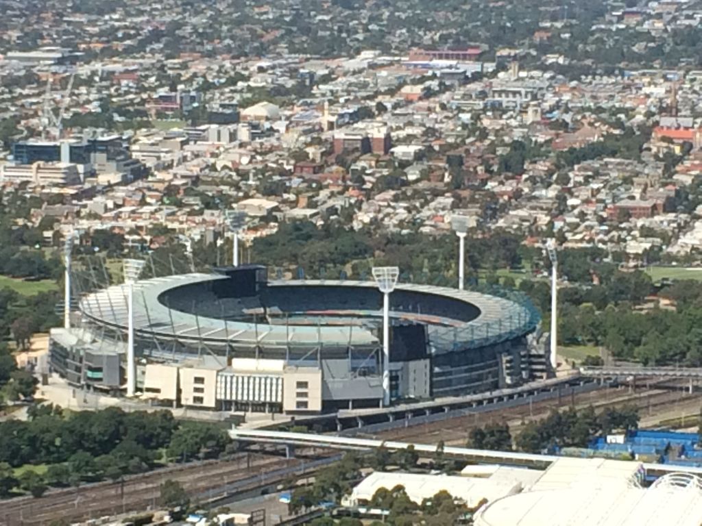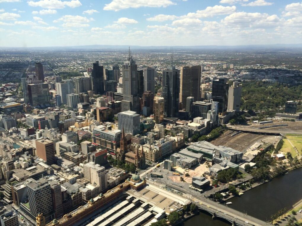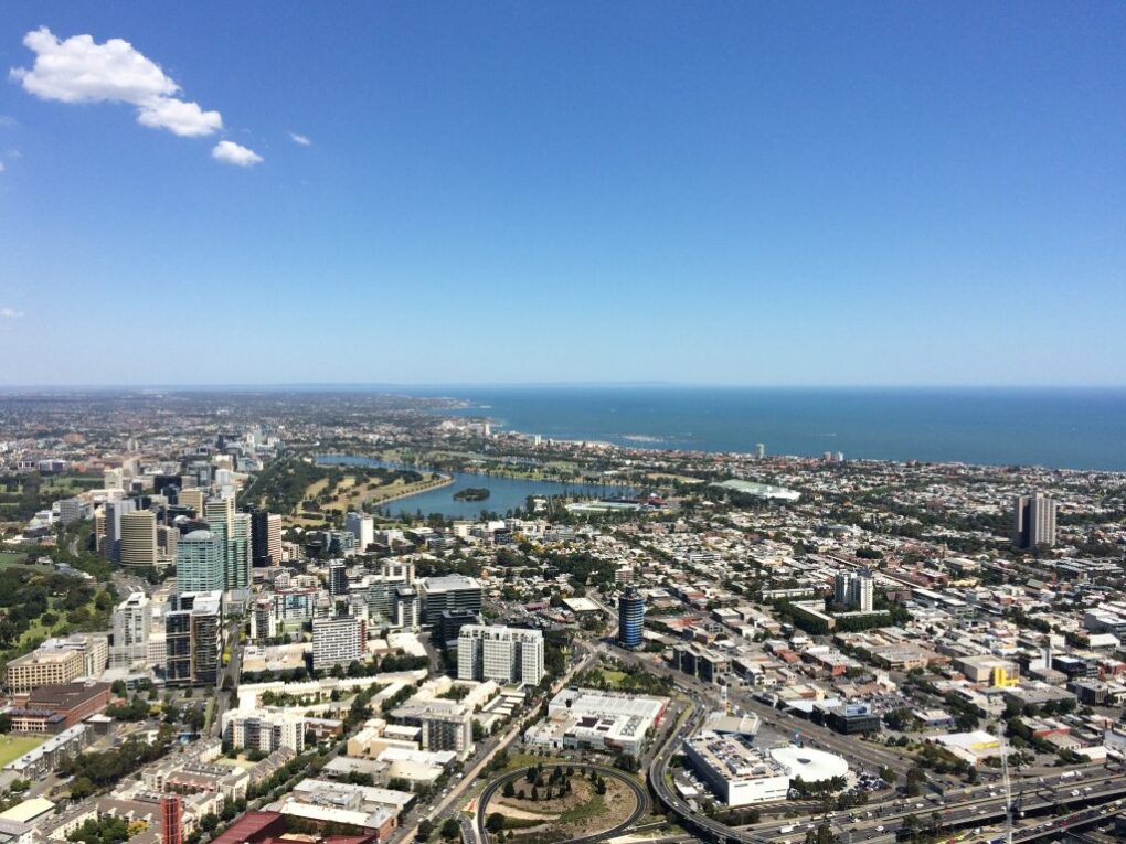 Auf 285m Höhe erreicht man in gerade einmal 39 Sekunden mit dem Aufzug das 88. Stockwerk, von dem aus man rundum auf Melbourne runterschauen kann. Neben dem Central Business District (CBD) direkt unterhalb des Towers auf der anderen Seite des Yarra River, kann man bis in die Port Philip Bay auf’s Meer, aber auf der anderen Seite noch viel weiter ins Inland schauen.
