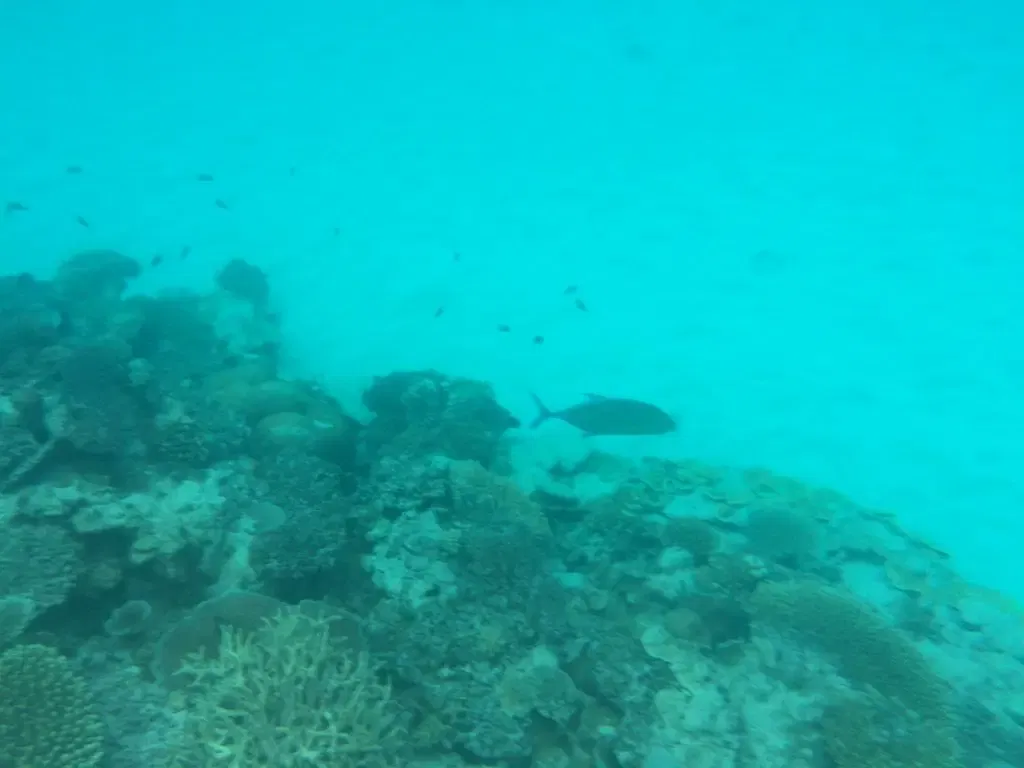 Der Strand vom Octopus Resort ist bei Ebbe ca. 15m und bei Flut ca. 5m breit. Direkt vor dem Strand erstreckt sich ein Korallenriff, das zum Schnorcheln einläd, was hier auch jeder Gast fast täglich tut. Direkt am Strand schwimmen sollte man nur bei Flut. Bei Ebbe hat man zwischen dem Riff und dem Strand nicht viel Platz, kann aber durch eine Schneise im Riff, die auch von den Booten genutzt wird hinter das Riff schwimmen. Hier – hinter dem Riff – fällt das Meer auf ca. 5-10m ab und auch als Schnorchler kann man hier sehr schön an der Kante entlang schwimmen und die Unterwasserwelt beobachten.