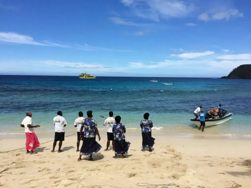 Mit 2 Mädels aus Kanada und Neuseeland, die bereits im Bus saßen, ging es morgens um 7.30 Uhr zum Hafen, von wo aus es dann mit Vollgas knapp 90 Minuten auf die Yasawa-Insel Waya ging, auf der das Octopus Resort liegt. Obwohl wir “nur” zu dritt ankamen, wurden wir 100m vor dem hellen Strand, in dessen Hintergrund alles mit Palmen bedeckt war und in dessen Vordergrund kristallklares, türkises Wasser leuchtete von einem kleinen Boot abgeholt und direkt am Ufer von mehreren Angestellten mit Musik, Gesang und Cocktails empfangen.