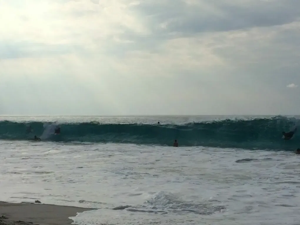 Je nach Wind sind Wellen mal höher (2m) und mal niedrieger bzw. kaum zu merken. Besonders morgens ist das Meer hier noch sehr ruhig, aber nachmittags kommen dann Sets rein, die jede Menge Bodyboarder anlocken. Teilweise steht man hier noch bis zur Hüfte im Wasser und kann sehen, wie die Welle über 1m über einem bricht. In dem Fall sollte man zusehen schnellstmöglich in die Welle zu tauchen.
