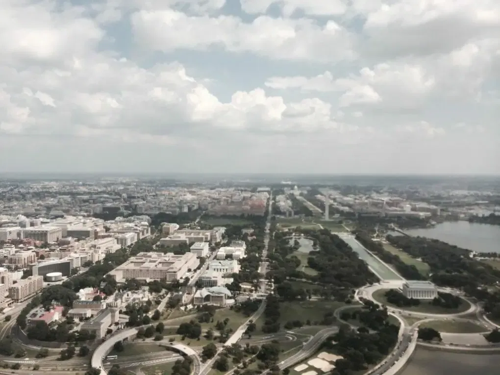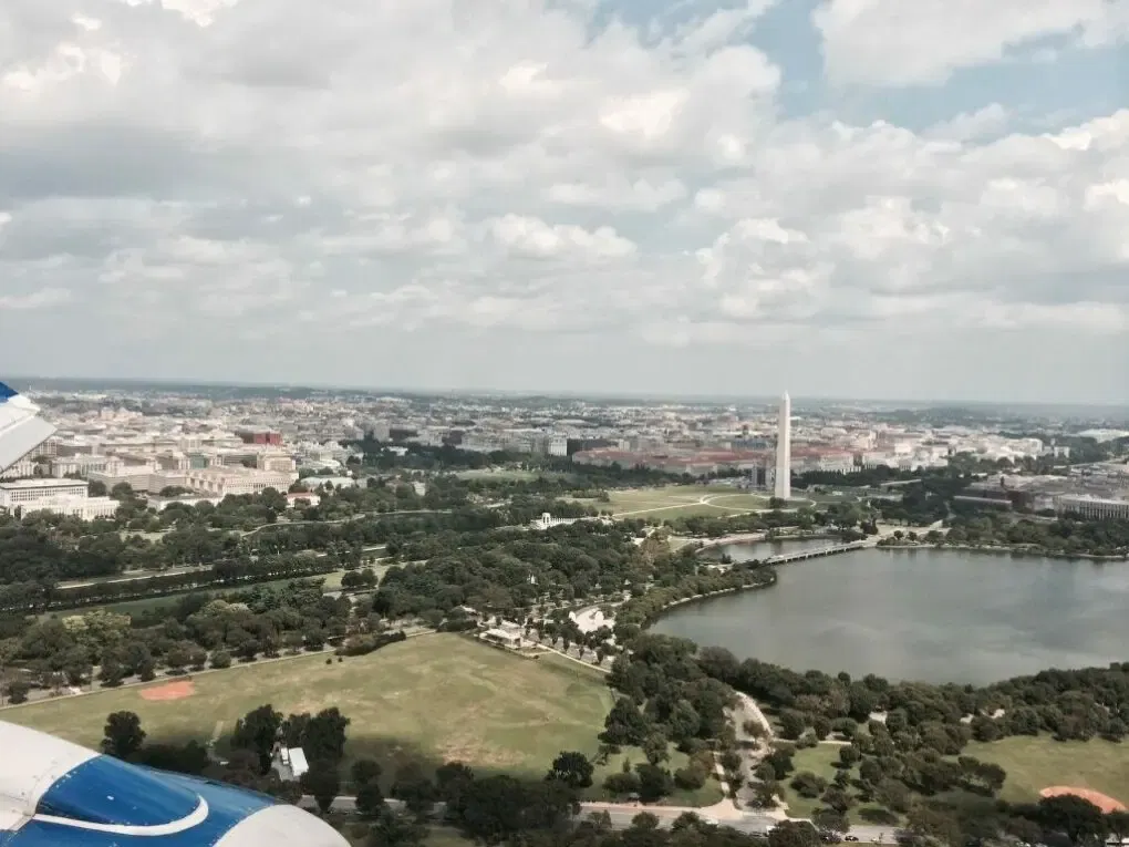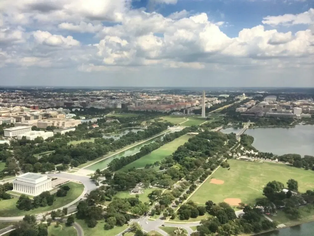 Der Landeanflug auf den Ronald Reagan Washington National Airport, bei dem es kurz vor der Landung – vermutlich wegen einer Flugverbotszone über der Stadt – nochmal eine scharfe Rechtskurve gab, bot ein recht schönen Überblick über die bekanntesten Sehenswürdigkeiten der Stadt, wie man auf dem Titelbild sehen kann.